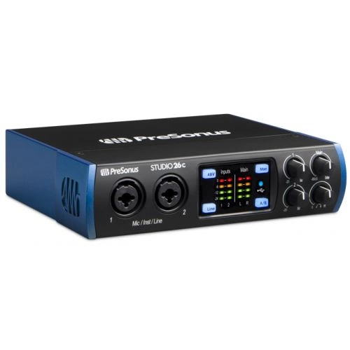Studio 26c jest idealny dla DJ-ów, muzyków mobilnych i muzyków elektronicznych, którzy oczekują doskonałej jakości dźwięku w solidnej, przenośnej formie. Ten zasilany magistralą interfejs audio w 2 wejściami/4 wyjściami nagrywa dźwięk z maksymalną częstotliwością próbkowania 192 kHz i ma 2 wejścia mikrofon/linia/instrument, sprzężone stałoprądowo wyjścia liniowe, wejście/wyjście MIDI oraz przycisk Cue Mix A/B. Wraz ze Studio 26c jest dostarczany kompletny pakiet nagraniowy typu all-in-one. W jego skład wchodzi nagradzane oprogramowanie do produkcji muzyki Studio One® Artist firmy PreSonus do systemów MacOS® i Windows® oraz kable USB-C -> USB-C i USB-C -> USB-A, które zapewniają kompatybilność z większością komputerów.