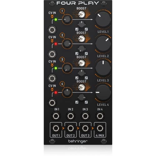 Behringer FOUR PLAY to zaawansowany wzmacniacz sterowany napięciowo (VCA) oraz mikser w formacie Eurorack, idealny dla muzyków i producentów dźwięku, którzy pragną uzyskać pełną kontrolę nad swoimi sygnałami audio.