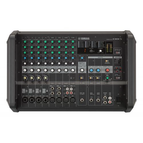 Yamaha EMX 5 - mikser z końcówką mocy. Emx 5 to powermikser o mocy 2 x 6300W/4oHm, do dyspozycji jest osiem kanałów mikrofonowych i cztery stereo - z czego cztery kanały stereo dysponują przedwzmacniaczem mikrofonowym. Nowością jest dostępny na czterech kanałach mikrofonowych kompresor, oraz sygnalizacja FCl-(Feedback Channel Location) - dioda LED: (sygnalizacja sprzężenia w torze).