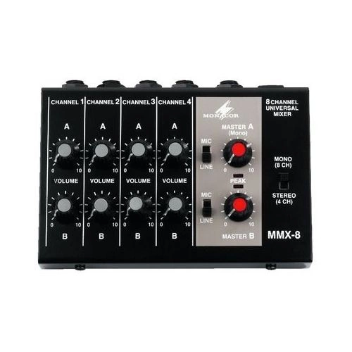 Zasilanie (alternatywne): 1 x gniazdo niskonap- 8 kanałów mono, przełączanych mikr./linia
