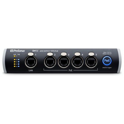 Switch SW5E AVB firmy PreSonus dostarcza pięć portów AVB z bezpiecznym blokowaniem złącz. W połączeniu z wytrzymałą konstrukcją sprawia, że SW5E jest szczególnie dobrym wyborem do nagłośnienia na żywo. Wskaźniki łącza sieciowego/działania pomagają zapewnić prawidłowy przepływ danych w sieci.