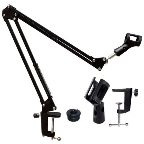 Poczuj wygodę za niewielkie pieniądze. Poznaj cechy biurkowego uchwytu na mikrofon. Nie od dziś wiadomo, że wygoda w pracy i zabawie jest bardzo ważna. Ergonomia odgrywa coraz większe znaczenie w świecie. Nie bez powodu. Ma to ogromny wpływ na osiągane wyniki. Biurkowy statyw mikrofonowy pozwala skupić się w 100% na osiągnięciu najlepszych rezultatów w śpiewaniu, komentowaniu czy prowadzeniu audycji radiowych. Ten zaawansowany uchwyt mikrofonowy zaprojektowany jest między innymi do radia, telewizji, studio nagraniowych i do użytku domowego. Wysokość oraz kąt można dowolnie dopasować do swoich potrzeb. Biurkowy uchwyt pozwala na profesjonalne zamocowanie mikrofonu do stołu, a dzięki ruchomym połączeniom możliwe jest obracanie statywu w promieniu 360°. Od dziś możesz ustawić mikrofon na idealnej wysokości dla twojej pozycji. Solidna konstrukcja, montaż statywu na zacisk lub śruby. Pozwala podwiesić mikrofon w taki sposób aby nie dotykać mikrofonu w trakcie pracy. Kupując ten statyw zyskasz nową wygodę pracy a w konsekwencji przewagę nad swoimi konkurentami czy to w audycjach radiowych, grach, czy studiach nagraniowych. Skup się na tym co najważniejsze czyli wokalu. Nie zaprzątaj sobie głowy niewygodną pozycją przed mikrofonem. Zrób porządek ze swoimi kablami. Uporządkuj swoje stanowisko pracy. Poczuj się jak profesjonalista w zaciszu domowym. Łożysko metalowe pozwala na montaż prawie każdego dostępnego mikrofonu na rynku. Minimalistyczny czarny design to kolejny atut tego produktu. Statyw wykonany jest z dobrej jakości metalu który zapewni długą i bezawaryjną pracę. Statyw obraca się wokół własnej osi! Po odkręceniu klipsów gwint śruby to 3/8″ – pasujące do większości mikrofonów.