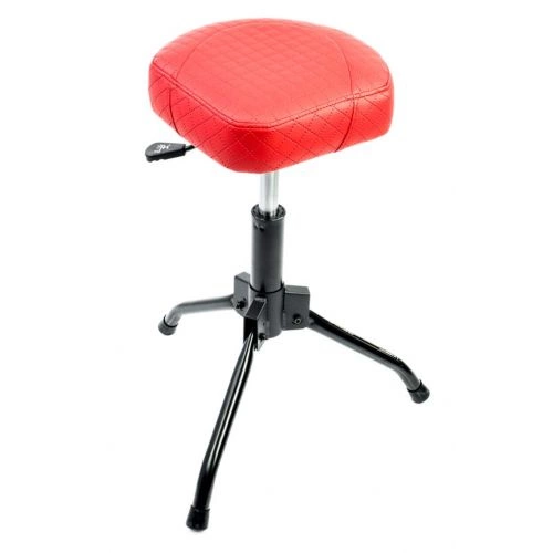 Wysokiej jakości, stabilny stołek dla perkusisty o pneumatycznie regulowanej wysokości z wygodnym, profilowanym siedziskiem, wykonanym ze skóry ekologicznej.