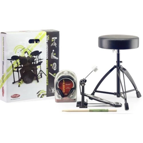 - W zestawie znajdują się: stopa perkusyjna PP50, stołek perkusyjny DT-32BK, słuchawki SHP-2300 i pałki SHV5A