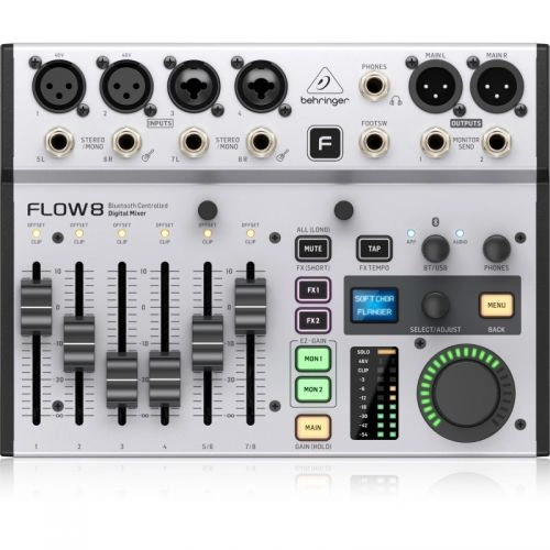 Behringer FLOW 8 to zaawansowany 8-kanałowy mikser cyfrowy, idealny dla muzyków, DJ-ów oraz realizatorów dźwięku, oferujący funkcje strumieniowania Bluetooth oraz zdalnego zarządzania przez aplikację mobilną.