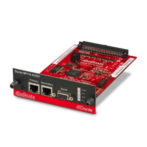 Karta Dante-MY16-AUD2 to w pełni kompatybilna karta w standardzie Yamaha Mini-YGDAI, która natychmiast umożliwia podłączenie miksera, procesora lub wzmacniacza mocy Yamaha do sieci Dante. Każda karta Dante-MY16-AUD2 zapewnia 16 dwukierunkowych kanałów audio (8 przy 96 kHz) i pełną redundancję sieci audio Dante przez Gigabit Ethernet.
