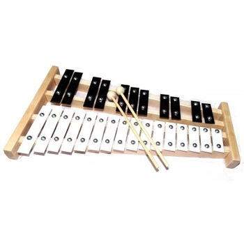 - Glockenspiel– to instrument perkusyjny, którego blaszki są ustawione w linii i strojone do określonych tonów. Często ma mniejszą liczbę tonów (od 8 do 15) i wykorzystywany jest w orkiestrach, szkołach muzycznych, jak również w muzyce popularnej.