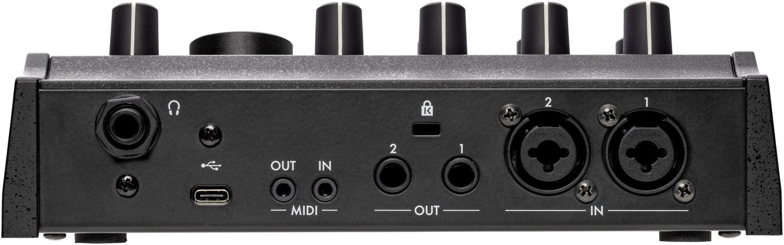 - ✔️ Wejścia combo z phantom 48 V — dwa kanały mikrofon/linia/Hi-Z z możliwością zasilania kondensatorów i pracy z gitarami oraz syntezatorami.