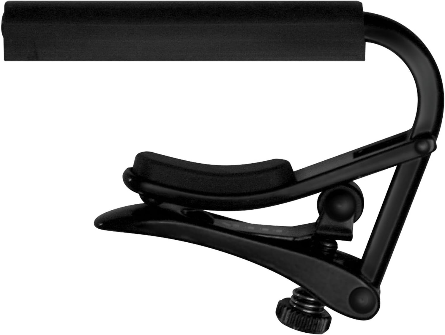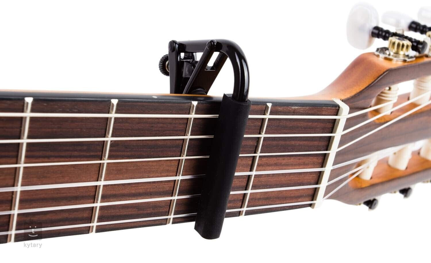 Wykonany z mosiądzu i pokryty czarnym chromem, kapodaster łączy trwałość z nowoczesnym wyglądem. Miękka guma dociskowa naśladuje nacisk palca, co minimalizuje ryzyko rozstrajania i chroni gryf przed uszkodzeniami.