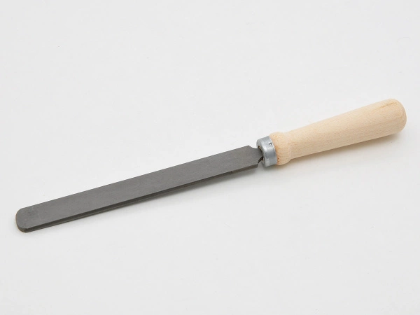 Wysokiej jakości pilnik do precyzyjnego formowania progów, wyposażony w dwa cienkie krawędzie tnące o szerokości 3 mm. Idealny do większości rozmiarów progów, z wyjątkiem bardzo wąskich progów vintage lub progów mandolinowych. Długość z drewnianą rączką wynosi 25 cm, a szerokość to 16 mm.